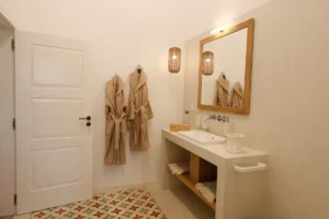 La «Casa da Água» (Maison de l’Eau) fait face à la fontaine du jardin principal. La couleur vert d’eau et les photos aux tons pastel qui la décorent s’inspirent des villages alentours. La superficie de la Casa da Água est de 113 m2 auxquels on peut ajouter les 50 m2 de la suite Céu située juste au-dessus.