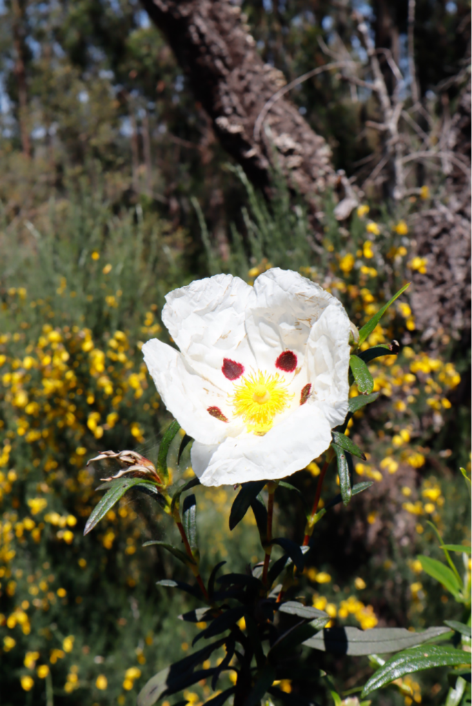 La flore environnante est typiquement méditerranéenne, mêlant thym et romarin, chênes-lièges, oliviers, amandiers, figuiers et caroubiers centenaires, tandis que le printemps transforme la région en un exubérant tapis de fleurs sauvages.