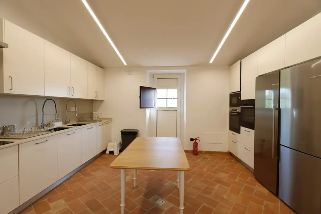 Vous y trouverez tout le matériel nécessaire, des casseroles à la vaisselle. La cuisine s’ouvre sur une terrasse orientée au nord et bénéficie d’un accès indépendant depuis le patio. En déverrouillant la porte intérieure sécurisée, il est facile de rejoindre le dortoir Floresta. Depuis le patio, on peut également accéder aisément aux grandes terrasses du jardin avant et à la Casa da Terra, offrant une circulation fluide et pratique entre les différents espaces du domaine.